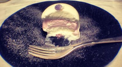 Macarrón de coco con espuma de canela y limón, helado de violeta y un toque de miel.