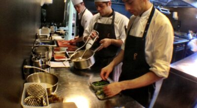 Jordi trabaja en uno de los platos, codo con codo con los demás cocineros de El Celler.