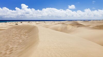 Maspalomas, al sur de Gran Canaria, cuenta con una de las playas más especiales de España. Se trata de una gran playa rodeada de dunas inmensas que han sido esculpidas por el viento con el paso del tiempo. La arena suele estar muy caliente, pero también es muy fina y exótica.