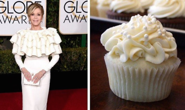 El vestido blanco con escote de volantes elegido por la veterana actriz Jane Fonda se ha convertido en un meme, las redes sociales han comparado su look con una ‘muffin’ de merengue.