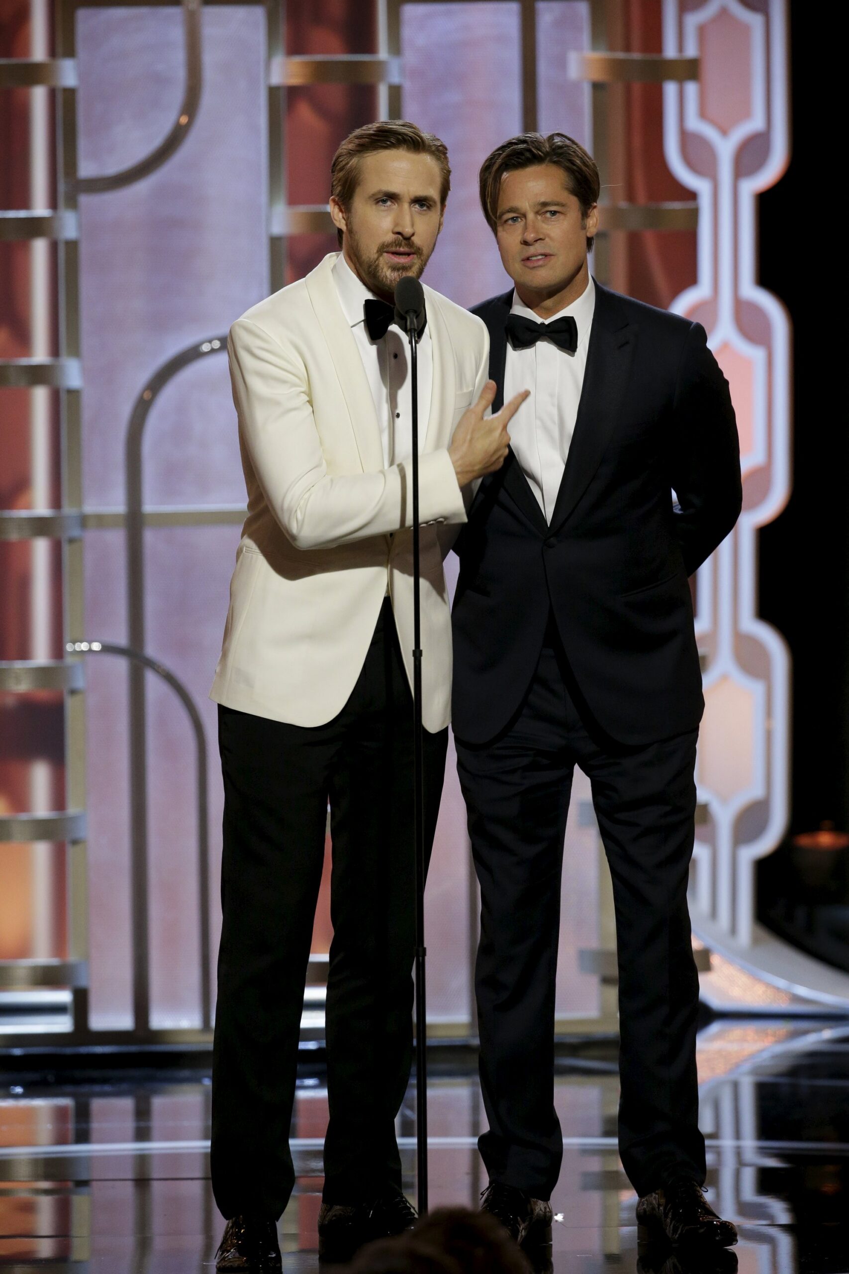 Y por último, esta gala nos dejó una imagen para la posteridad: Brad Pitt y Ryan Gosling juntos en el escenario. Estos dos guapos (muy guapos), cada uno con el traje de un color, salieron a presentar la nueva película que protagonizan junto a Christian Bale, «La gran apuesta».