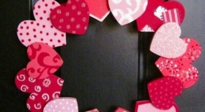 Viste tu puerta con una corona deSan Valentín hecha con flores, ramas, piruletas y figuritas, como un Cupido o un arco.
