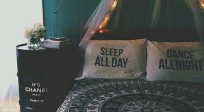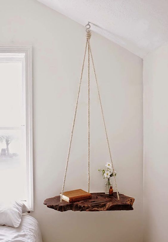 Una de las ideas más originales que hemos encontrado ha sido esta mesita-columpio de noche. Nos encanta la idea de tener una repisa colgante y que además, como decíamos, puedes hacer hasta por ti misma. Una tabla de madera y unas cuerdas de soga que sean seguras para sujetar el peso que apoyaremos en nuestra mesa será suficiente. ¿A que te encanta para tu habitación?