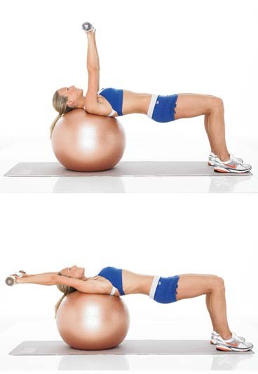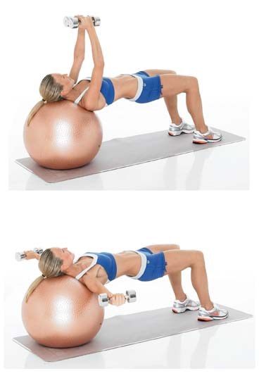 Primero túmbate boca arriba en el balón de estabilidad con las rodillas en ángulo. Ahora coge una mancuerna en cada mano y levanta los brazos hacia el techo con las palmas mirando hacia el frente. Esta es la posición inicial. Pasa los brazos sobre la cabeza manteniéndolos rectos y vuelve a la posición inicial.