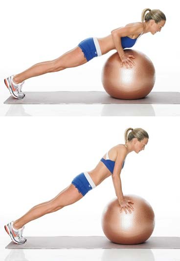 Túmbate con el pecho contra el balón de estabilidad y coloca las manos junto al pecho, sobre la pelota, con los dedos bien abiertos. Estira los brazos y sepárate de la bola y baja controlando.