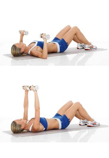 Primero túmbate boca arriba con las rodillas dobladas y una mancuerna en cada mano, y baja las mancuernas a la altura de los hombros con las palmas mirando hacia el frente. Después extiende los brazos hacia el techo y baja las mancuernas hasta que toques el suelo con los codos. Vuelve a subir los brazos hasta la posición inicial.