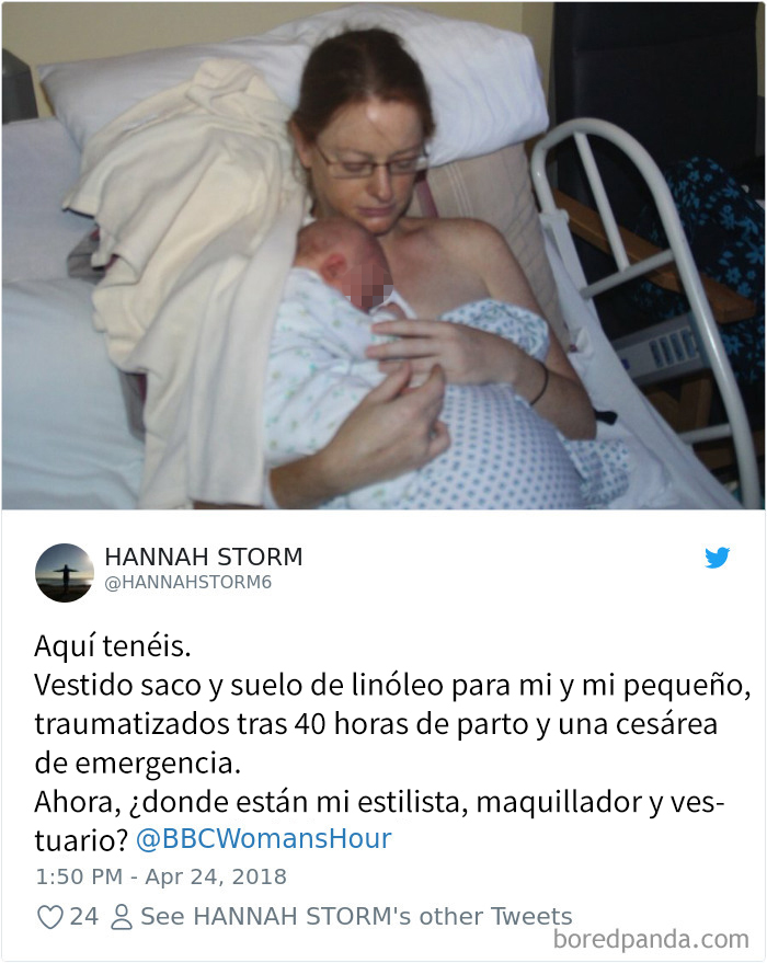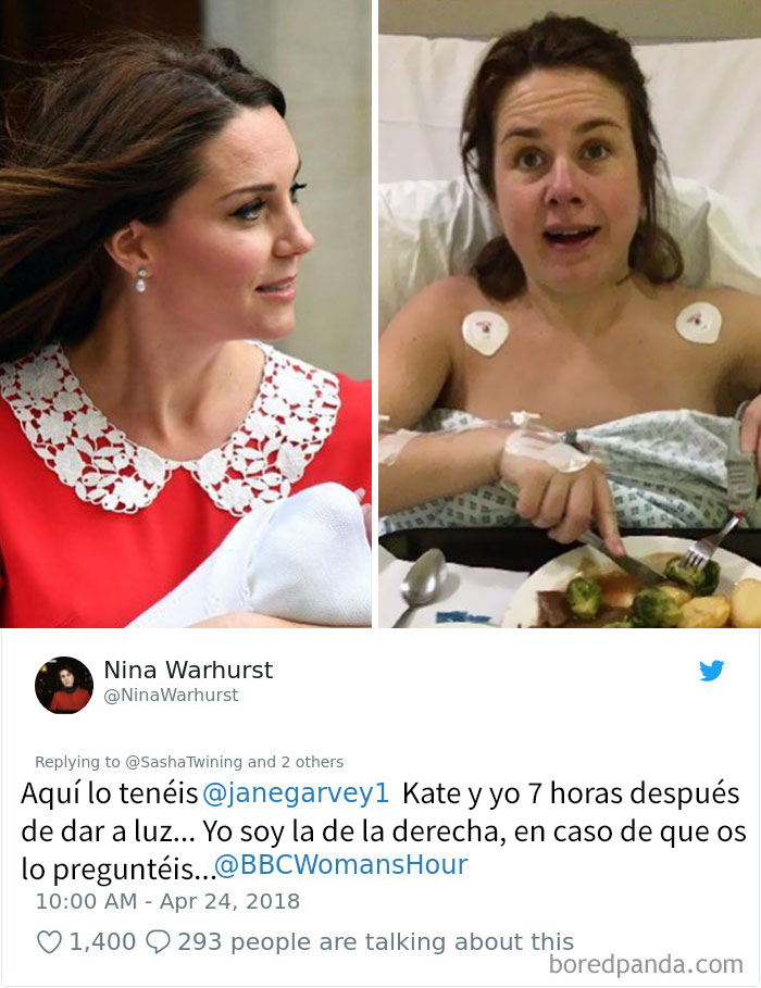 El toque de humor lo ponen un grupo de madres que han decidido compartir en las redes sociales fotos en las que salen ellas mismas tras haber dado a luz. Con cara de cansadas tras el duro trabajo que supone parir, dando el pecho a sus bebés, dormidas por el cansancio… Muchas de ellas han explicado incluso las complicaciones que han tenido durante el proceso de parto, como una cesárea de emergencia u horas y horas hasta la llegada del ansiado momento. Lo cierto es que estas imágenes muestran una realidad que está muy lejos de ser como la de la duquesa de Cambridge.