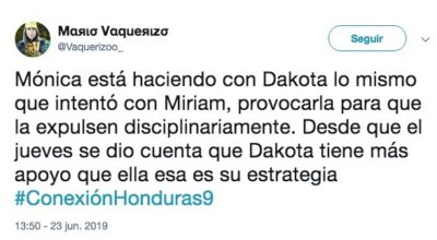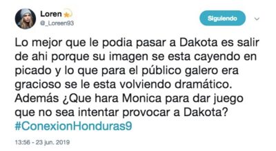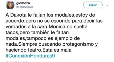 En Honduras no se salva ni uno de la ‘’furia Dakota’’. Primero fue Violeta, que terminó derrotada frente a la ilicitana, no precisamente por no saber desenvolverse en las batallas dialécticas sino por un problema de vesícula que la obligó a abandonar el reality. Más tarde llegaba el turno de Colate; Dakota y él se enzarzaron en varias discusiones a cada cual más ridícula y sorprendente que terminaron con el ex marido de Paulina Rubio evacuado de la isla por una importante lesión de clavícula –provocada durante una de las pruebas de recompensa semanales- y con la ex de Hermano Mayor creyéndose dueña y señora de la isla, cual Pantoja en sus mejores momentos. Y por último y no por ello menos importante, la guerra con Mónica Hoyos. Las concursantes no pueden verse ni en pintura y tras una polémica bronca entre ambas por la supuesta ‘’traición’’ de Isabel Pantoja a Mónica Hoyos, Dakota ha terminado coronándose como la superviviente más violenta que ha pisado los Cayos Cochinos.