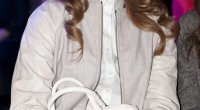 Lana del Rey con pantalones pitillo, camiseta y chaqueta verde.