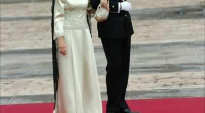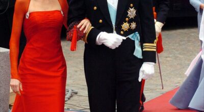 Boda del príncipe Haakon de Norega y Mette Marit Tjessem en el Palacio Real. En la imagen, la modelo Eva Snnum acompaña al príncipe. Hubo rumores de un posible enlace entre ambos, pero tan sólo se quedó en una pasajera relación.