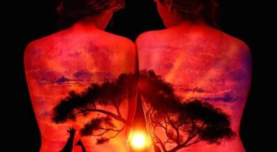 El body painting realizado por Poppleton con pintura fluorescente combina la belleza de la figura de la mujer con el esplendor de paisajes increíbles, reales o imaginarios. Las escenas pintadas directamente sobre la piel y las poses de las modelos consiguen hacer, de sus trabajos, obras de arte únicas y singulares capaces de cobrar vida propia.