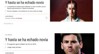Las diferencias salariales entre hombres y mujeres son un hecho: ya hemos observado cómo un hombre puede ganar 20.000 euros más que una mujer por realizar el mismo trabajo. Una diferencia que se presenta, como hemos dicho, sobre todo en el ámbito deportivo. Pero estas desigualdades no solo se quedan en el terreno salarial, también en el trato que los medios de comunicación dan a aquellas noticias en las que las mujeres son las protagonistas. Hace poco fuimos testigos del desafortunado titutal que el diario El Mundo escogió para celebrar los éxitos de Carolina Marín, dos veces campeona de Europa y del Mundo de bádminton. «Y hasta se ha echado novio», decidieron titular la noticia. ¿Os imagináis un titular similar para anunciar que Messi o Cristiano han ganado el balón de oro? «¡Y hasta se han echado novia!»