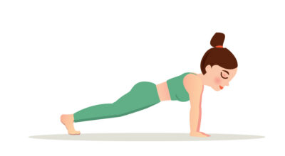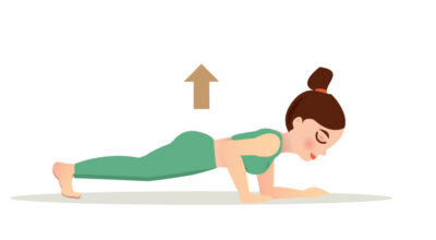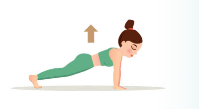 Este ejercicio consigue un mayor fortalecimiento de los músculos internos de la pared abdominal, las lumbares, los trapecios, y además los músculos de los brazos. Esta es una actividad similar a la anterior, pero en vez de estar apoyada con los antebrazos deberás tenerlos estirados.