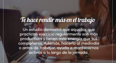 Un estudio demostró que aquellos que practican ejercicio regularmente son más productivo y tienen más energía que sus compañeros sedentarios. Además, hacerlo al mediodía o antes de trabajar, ayuda a mantenernos activos a lo largo de la jornada, evitando momentos de bajón o de falta de atención.