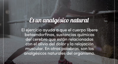 El ejercicio ayuda a que el cuerpo libere betaendorfinas, sustancias químicas del cerebro que están relacionadas con el alivio del dolor y la relajación muscular. En otras palabras, son los analgésicos naturales del organismo.