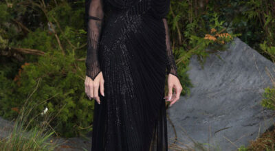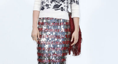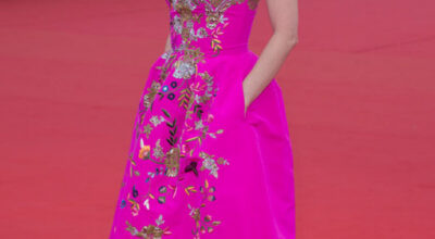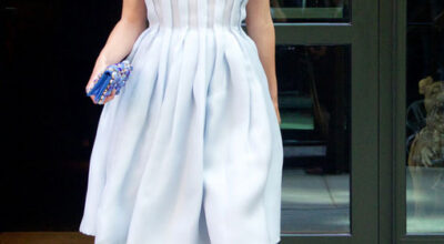 Pero no todos los looks de nuestra selección son de fiesta, también resaltamos este look naive, de Prada, de Keira Knightley.