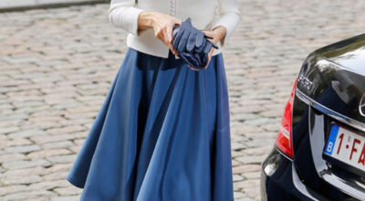 Nuestra Reina no podía ser menos. Elegante, sencilla y muy actual, arrasa con esta falda capa en seda azul, de Felipe Varela.