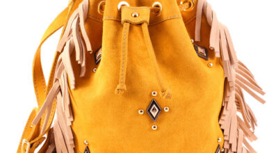 Bolso de ante, mostaza, con abalorios y flecos, de Mercules.