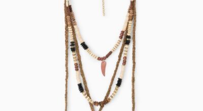Collar doble de piel, con plumas, abalorios y cuerno, de Mango (20 euros).
