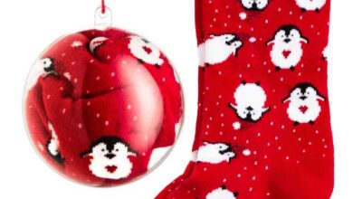 Calcetines con estampado de pingüinos en packaging en forma de bola de árbol de Navidad, de H&M (4,99 euros)