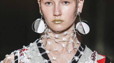 Esta temporada veremos muchos pendientes XXL que complementarán todo tipo de looks. Esta imagen es del desfile de Prada.