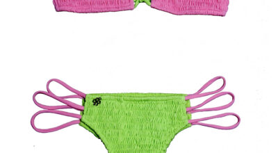 Bikini verde y rosa, fruncido, de Flor de Samui.