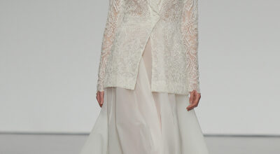 Ya te adelantábamos esta tendencia que también hemos visto sobre las pasarelas de esta edición. El traje de esmoquin versión Novia es una de las que más nos ha gustado. El romanticismo y la elegancia se dan la mano para conseguir piezas como estas de Juanjo Oliva y Juana Martin.