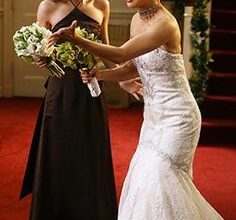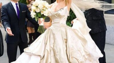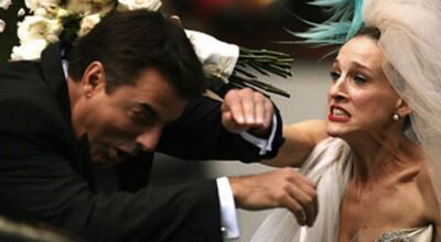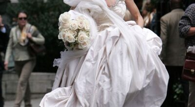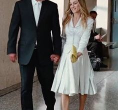 Carrie Bradshaw, el icono de estilo, la editora de moda más famosa de la Gran Manzana, la coleccionista de zapatos, sólo tenía un punto débil: Mr. Big. Tuvieron una boda frustrada, en la que ella se quedó plantada en el altar con su vestido de Vivienne Westwood color champagne y un tocado de plumas azules. A pesar de que intentaron varias veces rehacer sus vidas por separado, el destino siempre les volvía a unir. Su segunda boda, la buena, fue radicalmente opuesta a la anterior, y tan sencilla que Carrie optó por un dos piezas blanco sin firma y unos Manolos azules para contrarrestar tanta sobriedad. «Siempre tuyo, siempre mía, siempre nuestros».