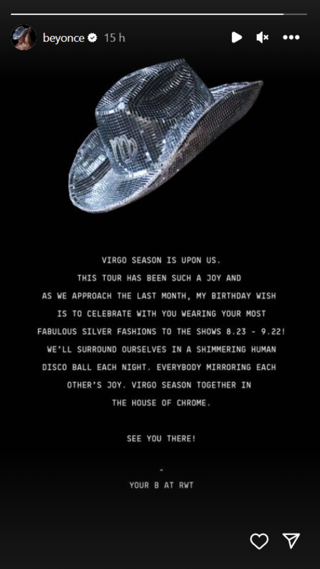 Para Beyoncé, esta solicitud va más allá de simplemente vestir de plateado. Es un llamado a la comunidad de fans para que se unan en una celebración cósmica y brillante. Sus palabras destilan un sentido de unión y alegría: «Cada noche nos rodearemos de una brillante bola de discoteca humana. Todos reflejando la alegría de los demás. Temporada de Virgo juntos en la casa del cromo. ¡Les veo allí!».