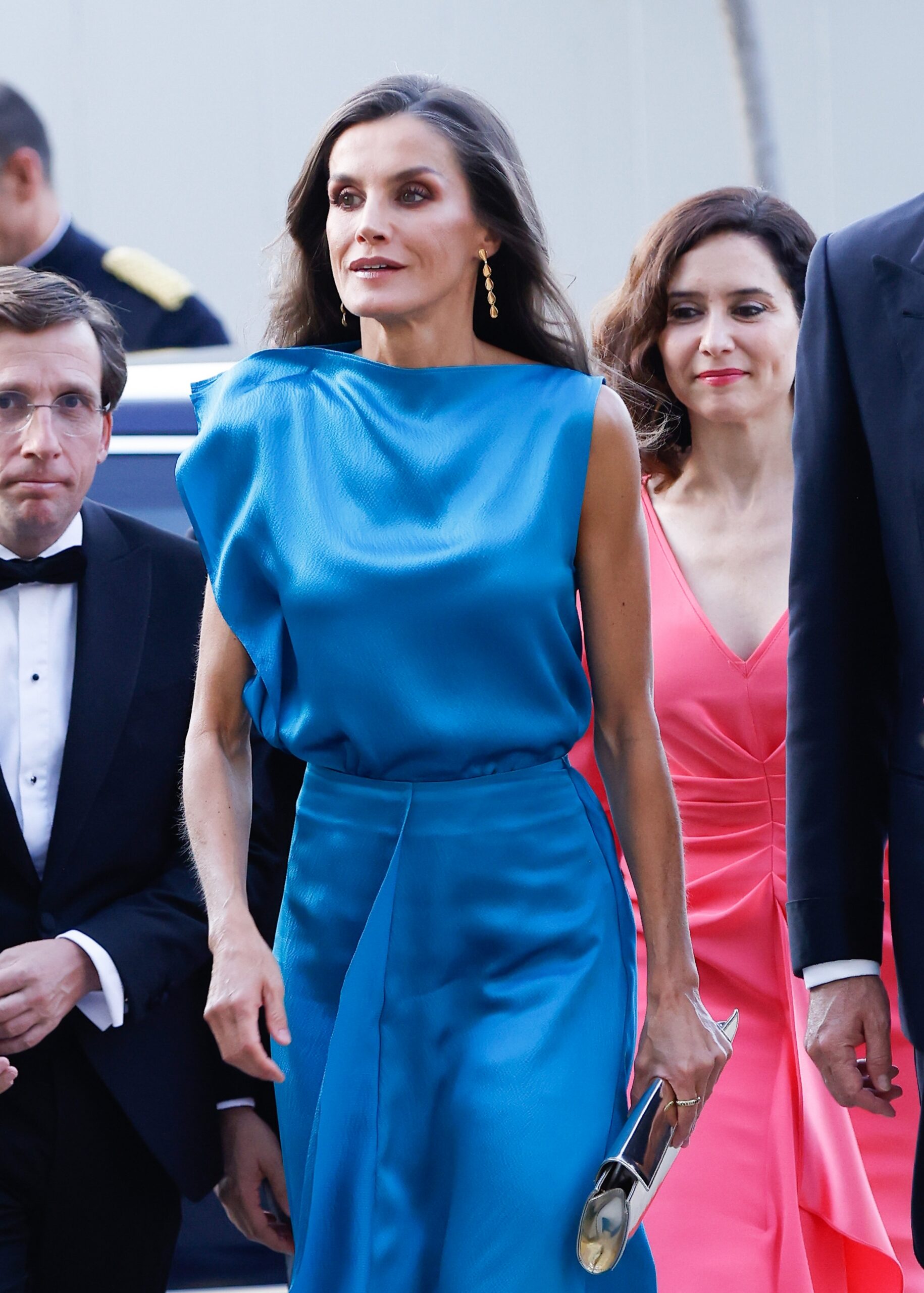 Es un vestido con diseño en dos piezas, sin mangas, con plisado en los hombros y cuello asimétrico. Para los complementos, eligió un sobre de mano en nude y unos pendientes de lágrimas de cristal XLL, que ya le vimos en el Teatro Real en el 2022.