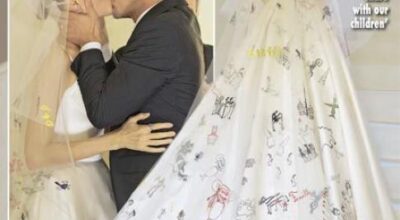 La revista Hello! y People muestran en sus portadas a la actriz luciendo un diseño confeccionado por Luigi Massi, de Atelier Versace en color blanco, con tirantes, el pecho fruncido y un velo clásico. Sin embargo, la sorpresa y originalidad se puede observar en la parte trasera del vestido. Angelina hizo de su vestido un lienzo y pidió a sus hijos que pintaran sobre él. Y así fue. Flores, muñecas y aviones son algunos de los objetos que sus pequeños pintaron en la cola y el velo.