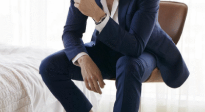En lo que parece una habitación de hotel, el actor británico posa además en traje azul, camisa blanca y descalzo, en una de las fotos, y solo con la camisa desabrochada, pantalones y mirada desafiante, en otra de las instantáneas.
