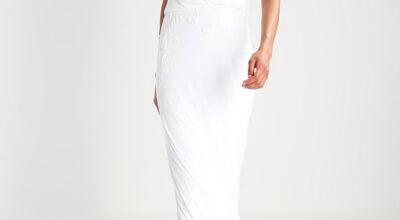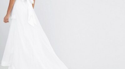 Vestido de novia estilo túnica, con escote drapeado cruzado, de Mascara (429,95 euros). A la venta en Zalando.