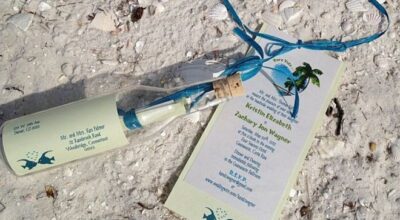 - Invitaciones de boda en botella: se trata de una forma original con un toque muy romántico. Es tan sencillo como meter un papel con toda la información de vuestra boda enrollado en una botellita de cristal. Este tipo de invitación es una buena opción para hacer vosotros mismos, ya que no es muy complicado, solo necesitaréis encargar los materiales y dedicarle un poco de tiempo.