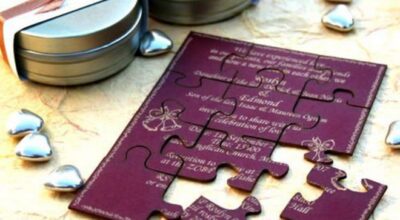 - Invitaciones puzzle para bodas: esta idea es perfecta si quieres implicar más a tus invitados. Se trata de una pequeña cajita en la que se encuentran las piezas que vuestros familiares y amigos tendrán que unir para enterarse de todos los detalles de la boda. Se trata de una de las opciones más originales, pero también de las más caras.
