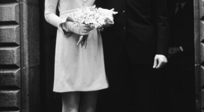 Bianca Jagger optó por un diseño sexy y masculino con una americana blanca con falda midi y pamela con velo, todo de Yves Saint Laurent. Un look rebelde que todavía se recuerda con asombro, claro que ser la novia de Mick Jagger, líder de los Rolling Stones exigía un outfit nupcial muy especial. La japonesa Yoko Ono se casó en deportivas, con unas medias hasta las rodillas y una falda corta con jersey a media manga. Un look inocente y divertido para una pareja peculiar. ¡Nos encanta que tanto Lennon como Yoko llevarán gafas redondas!