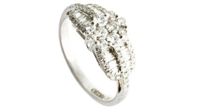 Sortija en oro blanco de 18 quilaes con un peso de 0.76 cts de diamantes en talla brillante y baguette con engaste en garras y carril.