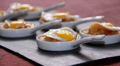 El secreto para un buen cocktail es la variedad: barra de carne, pescado, arroces o canapés, como estas mini sartenes con patatas y huevos de codorniz.