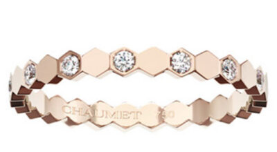 Anillo "Bee My Love" (sé mi amor) tallado en oro con pequeñas formas hexagonales y recubierto con diamantes.
