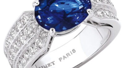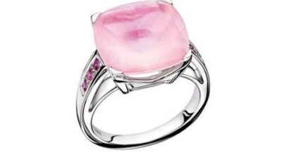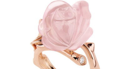 Cuarzo rosa de 6 quilates engastado en oro blanco de 18 quilates. Se trata de una oda al amor: su montura está recubierta por una serie de zafiros rosas.