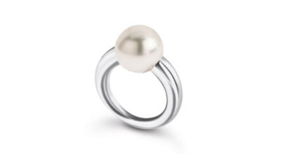 Anillo de platino con estructura lisa y una perla blanca en el centro.