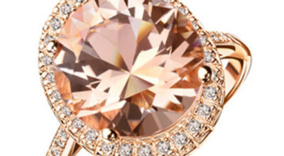 Anillo en oro amarillo con diamantes y centro de cuarzo rosa.