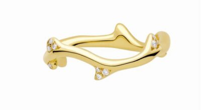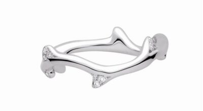 Anillo de oro blanco y diamantes con forma asimétrica y diseño muy original.