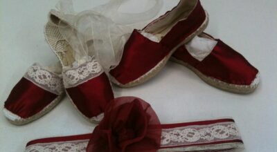 Conjunto de alpargatas para niño y niña con cinturón burdeos a juego.