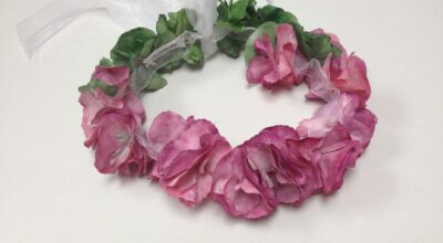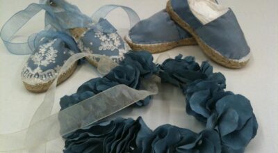 Conjunto de alpargatas para niño y niña con corona de flores a juego color azul petróleo.