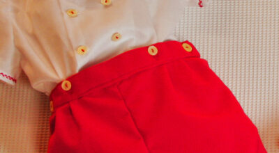 Conjunto de camisa y pantalón blanco y rojo para niño.