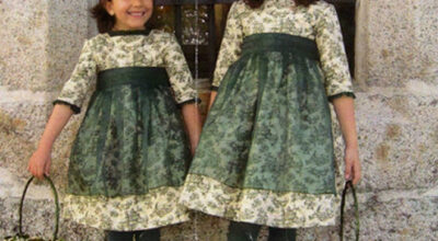 Damitas en el campo con traje color verde con estampado de flores y delantal.