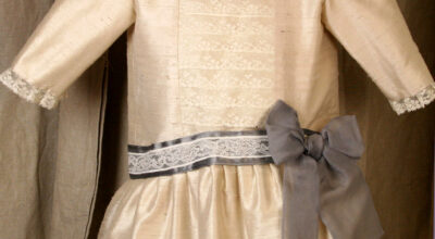 Vestido de seda salvaje color crudo con cinturón gris y detalle de lazo.