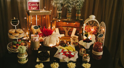 También es fundamental crear diferentes zonas para los invitados. Por ejemplo una zona de descanso con cómodas tumbonas en tonos tierra y amarillo. También podemos organizar un divertido photocall decorado con hojas amarillas o una zona infantil para que se diviertan los niños. Otra buena idea es crear un original candybar otoñal con dulces y postres realizados con calabaza, castañas o membrillo.
