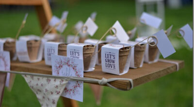 ¿Habéis pensado en dar diferentes regalos? Entonces, colocadlos en mesas distintas. Por ejemplo: alpargatas para bailar, kit de semillas para plantar, botellitas de vinos dulces y champán, cookies personalizadas, productos gourmet como miel o mermeladas de sabores…
